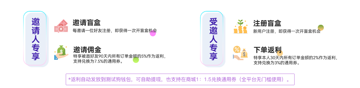 *獎勵自動發放到測試狗錢包,可自助提現,也支持在商城1:1.5兌換通用券(全平臺無門檻使用)。